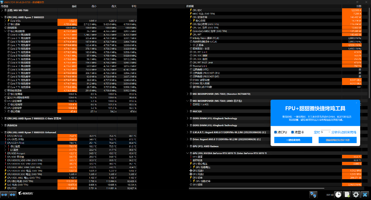 双烤测试中,9800x3D频率稳定4.7GHz,功耗143W,温度仅77摄氏度,得益于厚实的散热装甲,主板供电处的MOS管温度仅50摄氏度,5070Ti功耗300W,频率稳定2362MHz,温度65.6摄氏度,总体来说,整机性能释放相当充分。