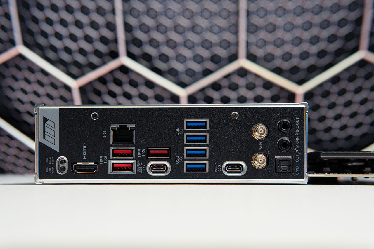 尾部接口按键包含ClearCMOS、HDMI、5G Lan、USB10Gbps Type-A*3、USB 5Gbps Type-A*4、USB 10Gbps Type-C、USB 20Gbps Type-C、WiFi天线接口、光纤音频口、3.5mm音频口*2,接口算是比较丰富。