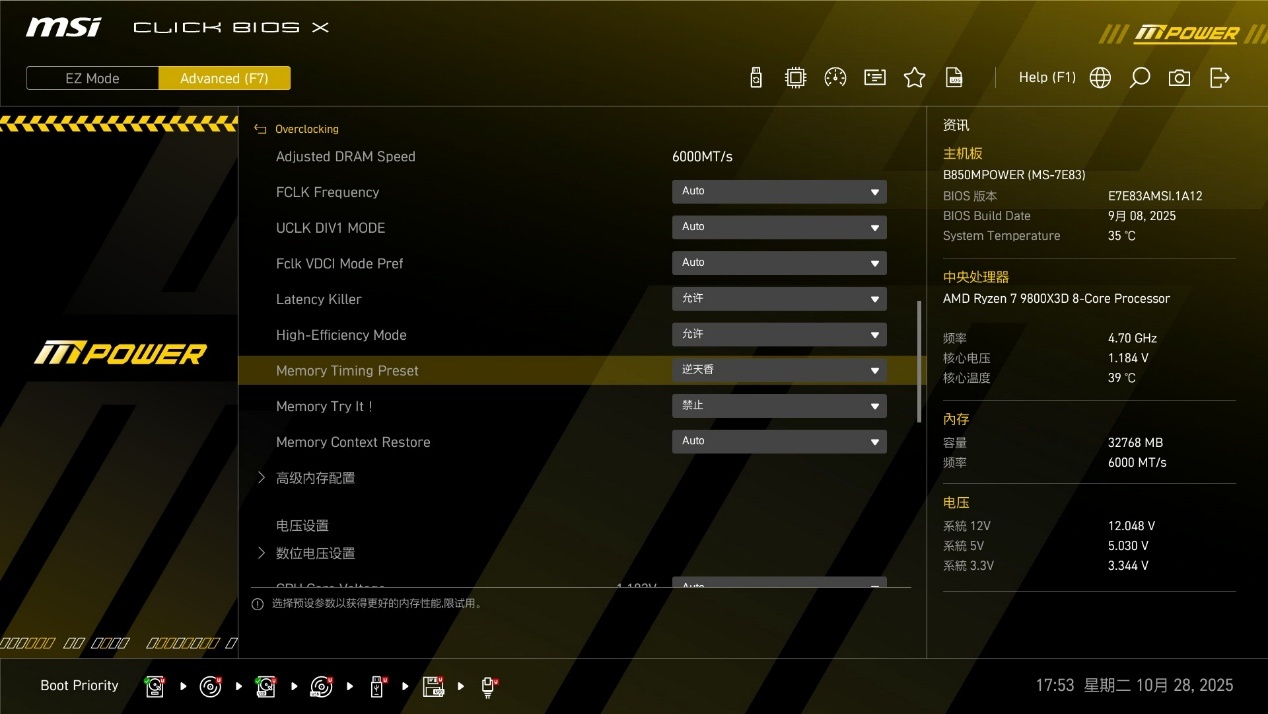 在高级设置中,微星B850MPOWER还提供了Latency Killer和High-Effciency Mode(低延迟、高带宽)给用户,在Menory Timing Preset(自动小参)还有多个档位可选,无脑选逆天香即可,低延迟高带宽可以大幅度提升内存性能,免费的功能建议各位及时开启。